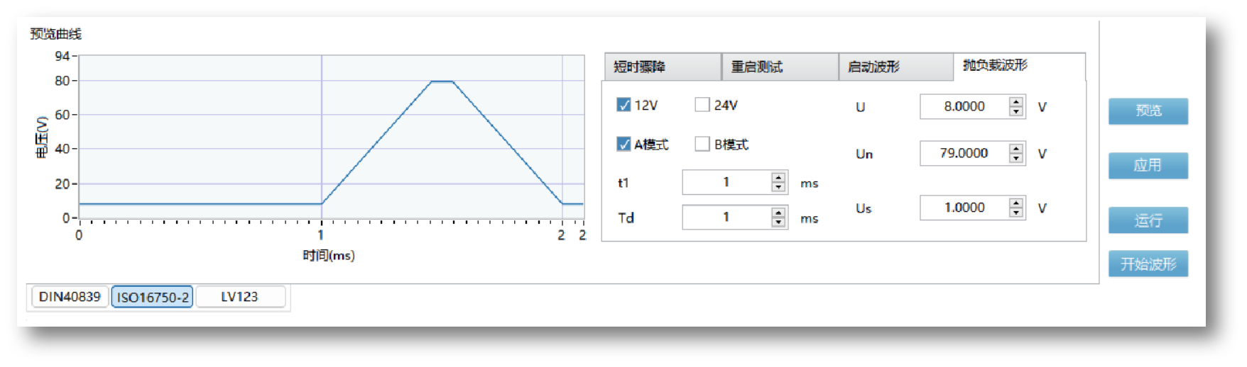 内置DIN40839、ISO16750-2、LV123汽车电子测试标准波形