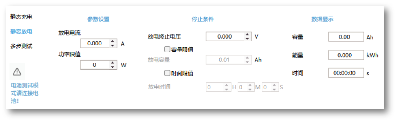 静态放电可设置 “放电电流”和“功率限值”,一旦超出功率限值,即进行恒功率放电